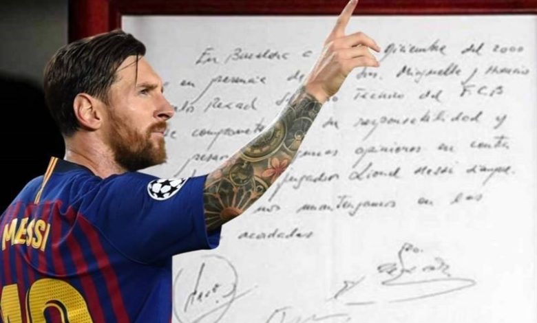 به گزارش خبرگزاری اسپرت 180، 24 سال پیش لیونل مسی با تکنیک مسحور کنندهاش، آن چنان مدیران وقت باشگاه بارسلونا، کارلس رکساچ (مدیر فنی) و خوسپ ماریا مینگیا (مدیر استعدادیابی) را برای عقد قرارداد با کودک آرژانتینی دستپاچه کرد که اولین چیزی که به دستشان رسید را برداشتند تا مفاد توافق خود با اوراسیو گاجولی، مدیر برنامههای وقت مسی را روی بنویسند. به این ترتیب بارساییها مسی که در آن زمان در تیم آکادمی باشگاه نیوولز اولدبویز آرژانتین توپ میزد را به موجب قراردادی که روی یک دستمال پارچهای نوشته شد مسی را به عضویت باشگاه بارسلونا درآوردند.